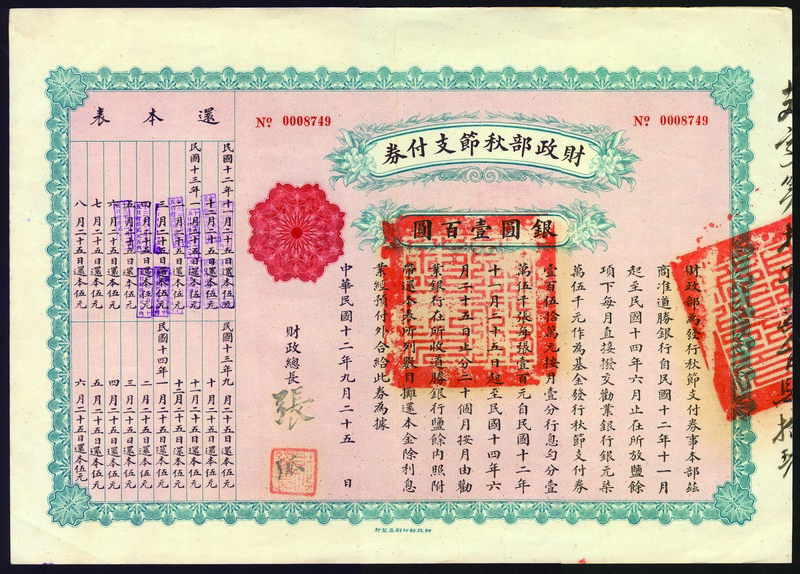 BONDS & SHARE CERTIFICATES: 1923 Republic of China Treasury Department, Autumn Festival Pay Coupon for 100 Silver Yuan, fine and scarce.