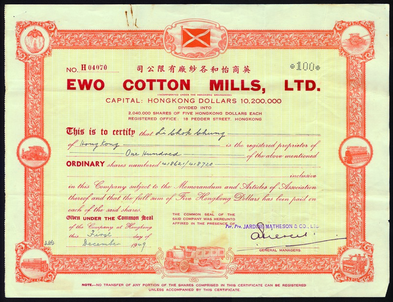 BONDS & SHARE CERTIFICATES: 1949 Ewo Cotton Mills Ltd, certificate of $5 share, 100 shares, fine.