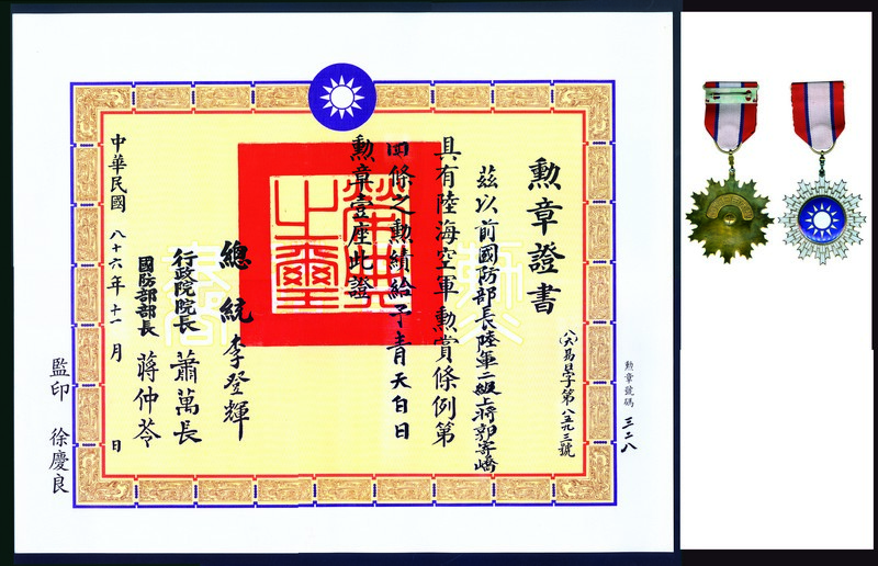 MEDALS & ORDERS: Republic of China Order of Blue Sky and White Sun Breast Badge, 58mm, silver, silver-gilt, and enamel, central medallion portraying the Chinese Sun on a blue background surrounded by a band of gold, reverse officially numbered "328", nearly extremely fine, with riband, together with accompanying certificate (number 8593), named in Chinese to Defence Minister (1951-1954) GUO Ji Qiao (1902-1998) dated November 1997.