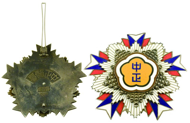 MEDALS & ORDERS: Republic of China Order of Chiang Chung-Cheng, 92mm, silver, silver-gilt, and enamel, central medallion portraying plum blossom motif with Chinese characters "Chung Cheng" on a yellow background, reverse officially number "027", very fine, believed to be awarded to Chang Daqing in 1982.