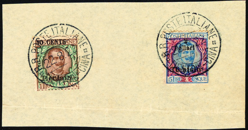 1918 Italian PO in China Second Surcharge "Tientsin" with Chinese Currency 40c on 1L and $2 on 5L (FI 53-54), used on piece with complete R R Poste Italiane Tientsin China 22.8.22 cds, rare high value usage.