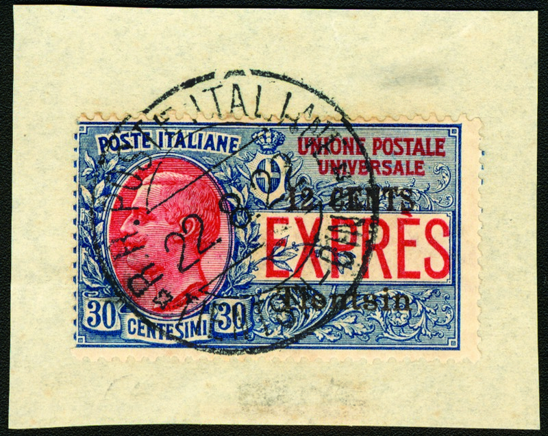 1918 Italian PO in China Express Stamp Surcharge "Tientsin" with Chinese Currency 12c on 30c (Chan FI E4), used on piece with complete R R Poste Italiane Tientsin China 22.8.22 cds.