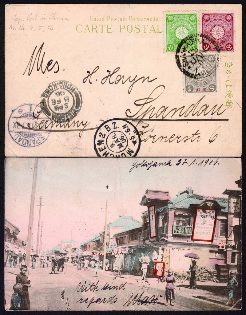 1906 (January 29) Colored Picture Post Card to Germany, franked with "China" overprinted Kiku series (3),tied by Shanhaikwan IJPO cds, Hong Kong & Munchen transit with Spandau arrival cds alongside, vertical crease line at middle.
