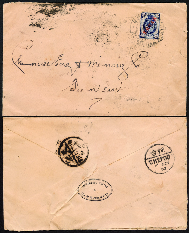 1902 (November 16) Cover from Port Arthur to Tientsin, franked with Russian PO overprints 7k, tied by Chefoo cds, on reverse Chefoo transit and Tientsin arrival cds, fine.
