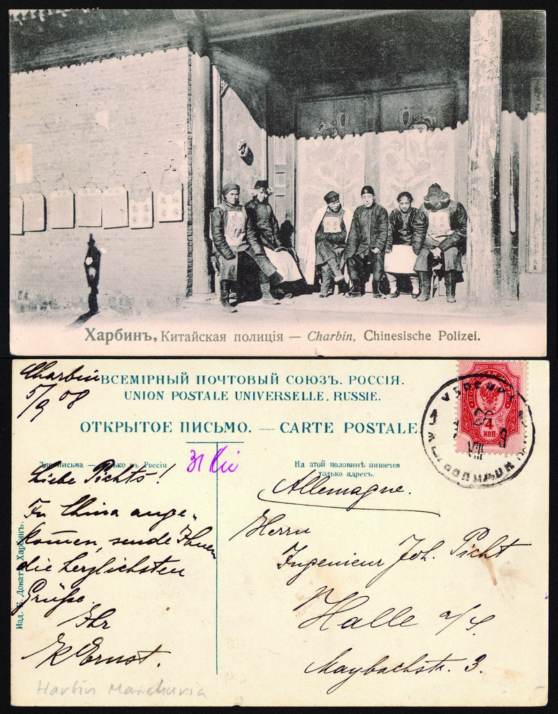 1908 (August 26) Post Card from Harbin to Kaybachstr, franked with Russian 4k, tied by Harbin cds, fine.