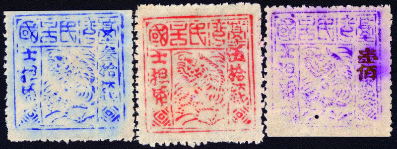 1895 Black Flag Republic Die II, set of 3, unused as issued, normal straight edge at top or bottom, 100 cash with tiny pin hole at bottom.