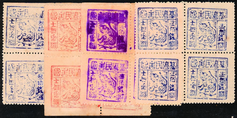 1895 Black Flag Republic Die III, set of 4 values in blocks of 4, including two blocks of 100 cash (blue and violet), unused with light toning.