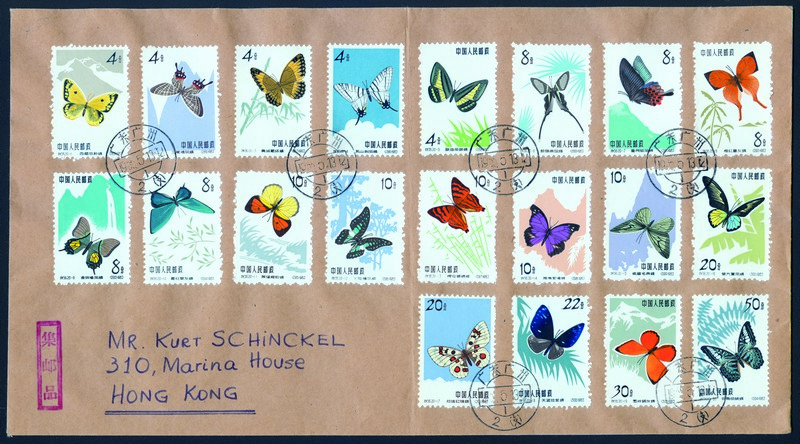 1963 (April 5) Butterflies (Yang S56), complete set of 20 used on philatelic cover to Hong Kong with 1965 Canton cds.