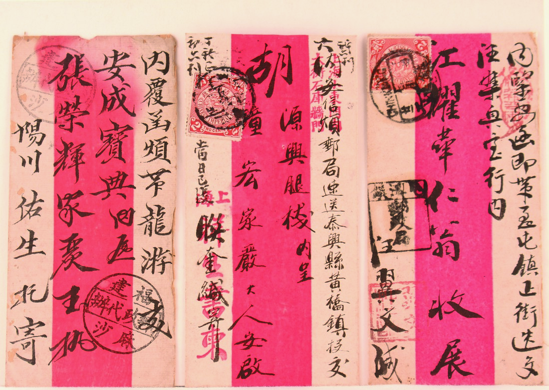 Group of Three Red Bank Covers, two franked with 2c coiling dragons, bearing various postal agency markings (3).
