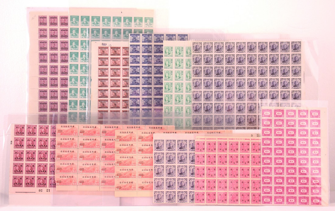 Republic of China Multiples, group of 12 large blocks, including various Dr SYS issues, air mail & revenues, also Gold Yuan and Japanese Occupation period material, plus 1959 Taiwan Chu Kwong Tower 3c orange in UM full sheet of 100 (900+).