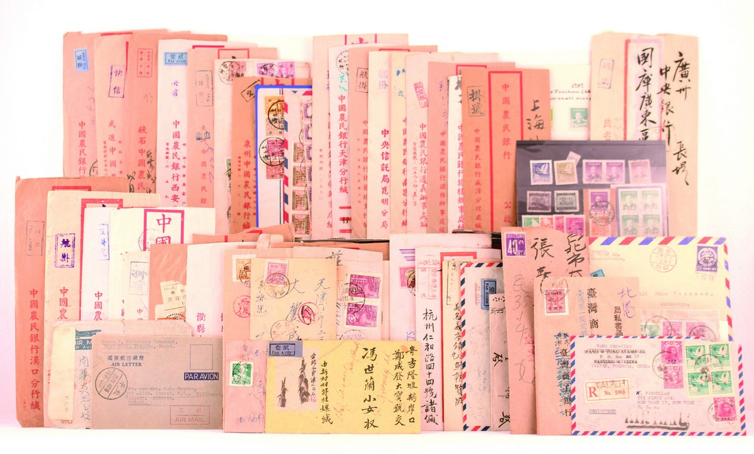 A Selection of Inflation-period Covers, with CNC (13) and Gold Yuan (37) with many registered, etc, displaying a very wide range of frankings, Silver Yuan Paid chop and a selection of stamps unused or used plus some others including People’s Republic and Taiwan, a good lot, well worth inspection.