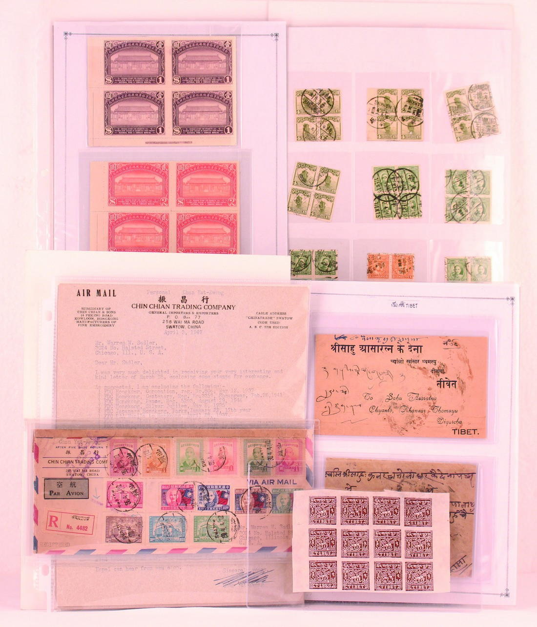 China Potpourri, including 1947 (April 4) registered airmail cover from Swatow to USA, several Junks, Dr SYS and Martyrs used blocks of four, used and unused cigarette revenues, some Tibet forgeries for reference use only.