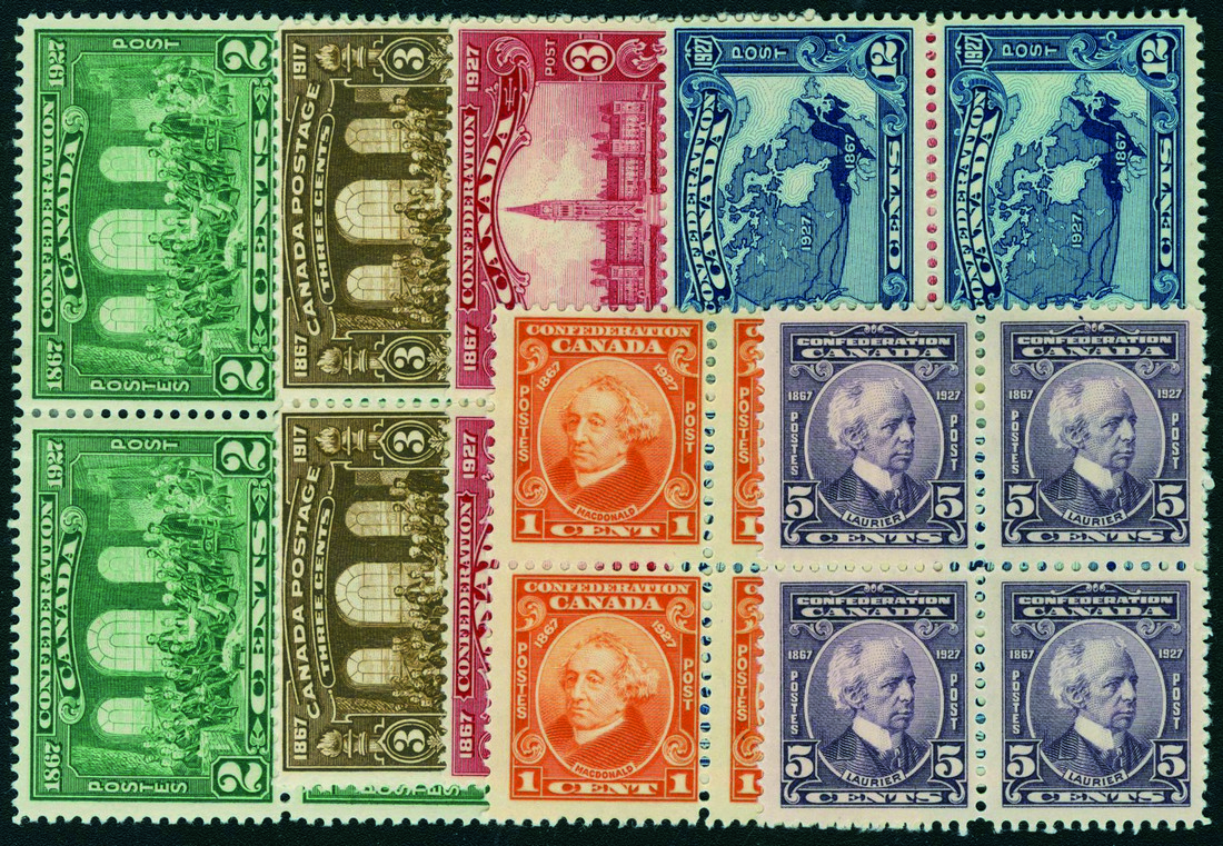 CANADA: 1917-27 50th & 60th Anniversary of Confederation (Scott 135, 141-5), total six values complete, all in blocks of four, fine mint, hinged top pair only (24).