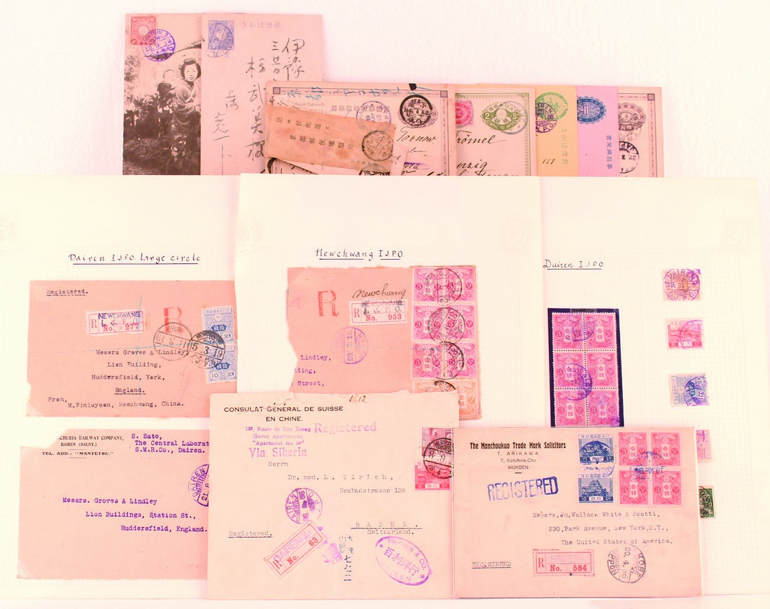 JAPAN: Selection of Stamps and Covers, small group of 17 stamps and 13 postal history items, mainly used in Manchuria and Northeast China to England and Switzerland, etc (30).