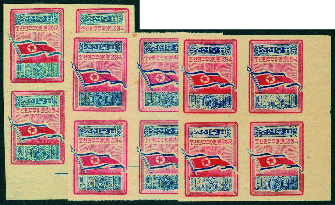 KOREA (North): Early Offset Varieties, group of three blocks of four, two with red and blue offsets on reverse, unused and rare (12).