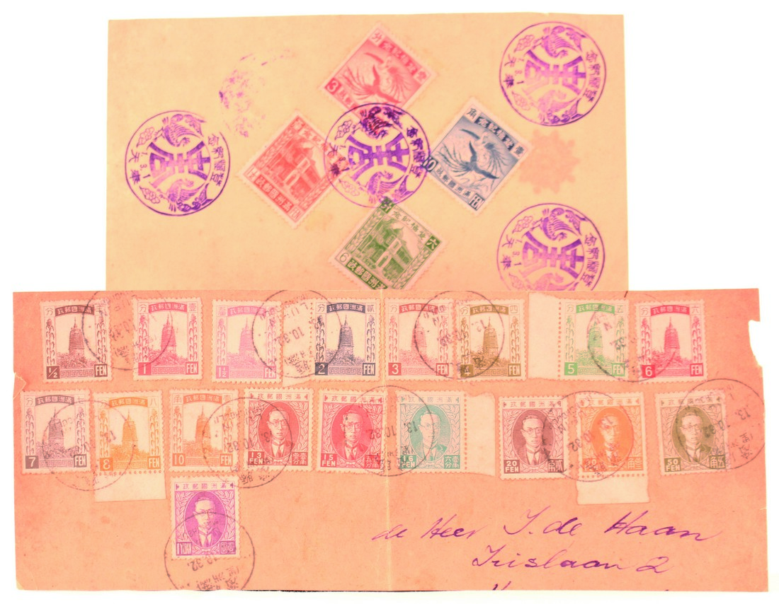 MANCHUKUO: 1932-34 First Definitives and Enthronement of Emperor Commemoratives (SG 1-18 & 32-35), two complete sets used on two large pieces.