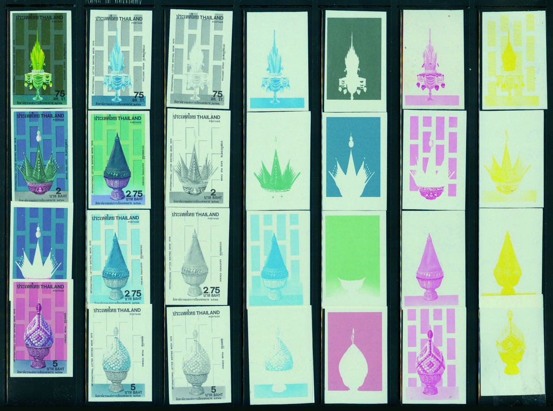 THAILAND: 1979 Letter Writing Week Imperforate Color Trial Proof (Scott 890-3), set of 28 values, all different and printed on full gum white paper with watermark “Harrison & Sons London” in script letter, including 75st(7), 2b(7), 2.75b(7) & 5b(7), rare and difficult set (28).