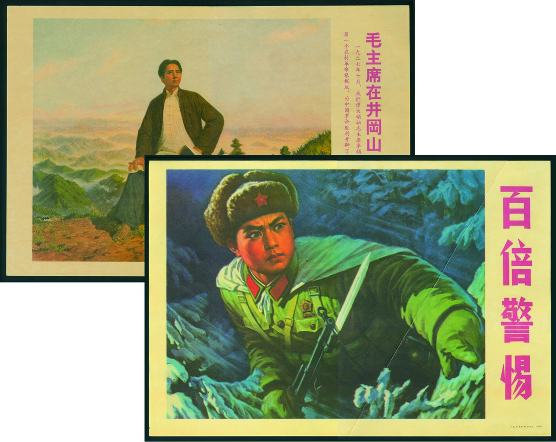 CULTURAL REVOLUTION PERIOD POSTERS: 1969-70 Group of Two Small Posters, featuring Chairman Mao in Jinggangshan, colored, size 25.5cm x 38cm, and PLA Soldier (diagonal folding line at right), size 26cm x 38cm, very well kept examples (2).