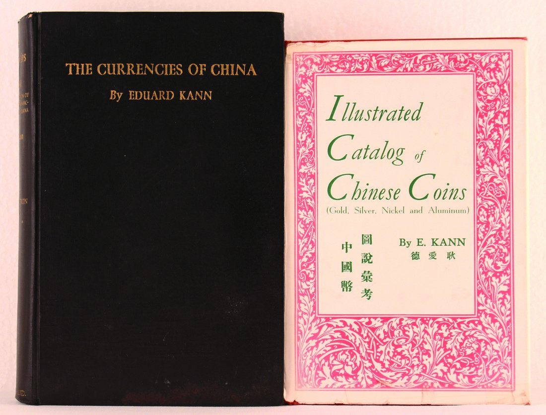 LITERATURE: 1927 “The Currency of China”, Shanghai, also 1966 “Illustrated Catalog of Chinese Coins”, New York, both written by Eduard Kann, printed by Kelly & Walsh Limited and Mint Production respectively, both in good condition, well known and excellent reference material (2).