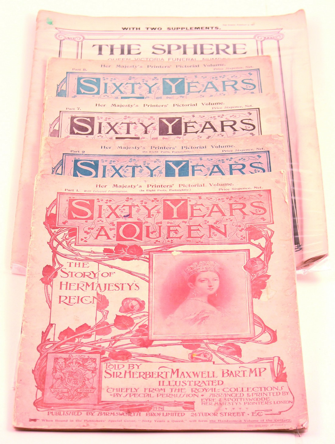 LITERATURE: Sixty Years A Queen “The Story of Her Majesty’s Reign”, group of 4 magazines, including part 1, 2, 7 & 8 with some scarce photographs of Queen Victoria, plus a special 1901 (February 9) edition of “The Sphere” on the funeral of Queen Victoria with a scarce funeral memorial booklet.
