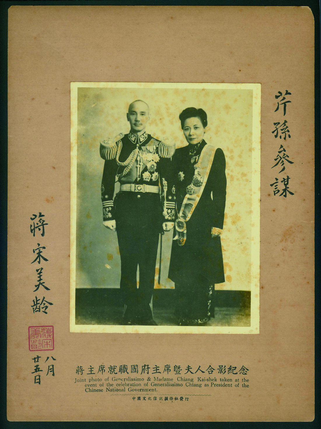 PHOTOGRAPH: Joint Photo of Generalissimo & Madame Chiang Kai-shek, taken at the event of the celebration of Generalissimo Chiang as President of the Chinese National Government, signed by Madame Chiang dated August 25th.
