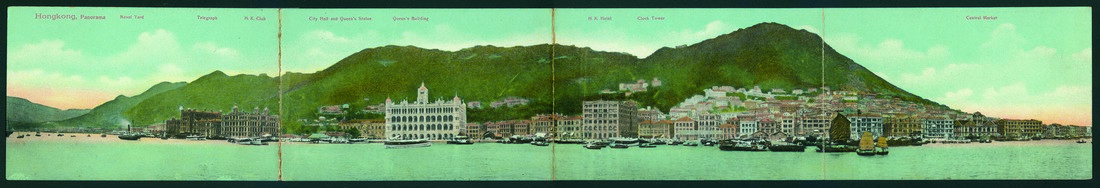 Picture Post Card: Hong Kong Panorama, 4-color, 3-fold, size 3.5” x 22”, circa 1900-1920’s.