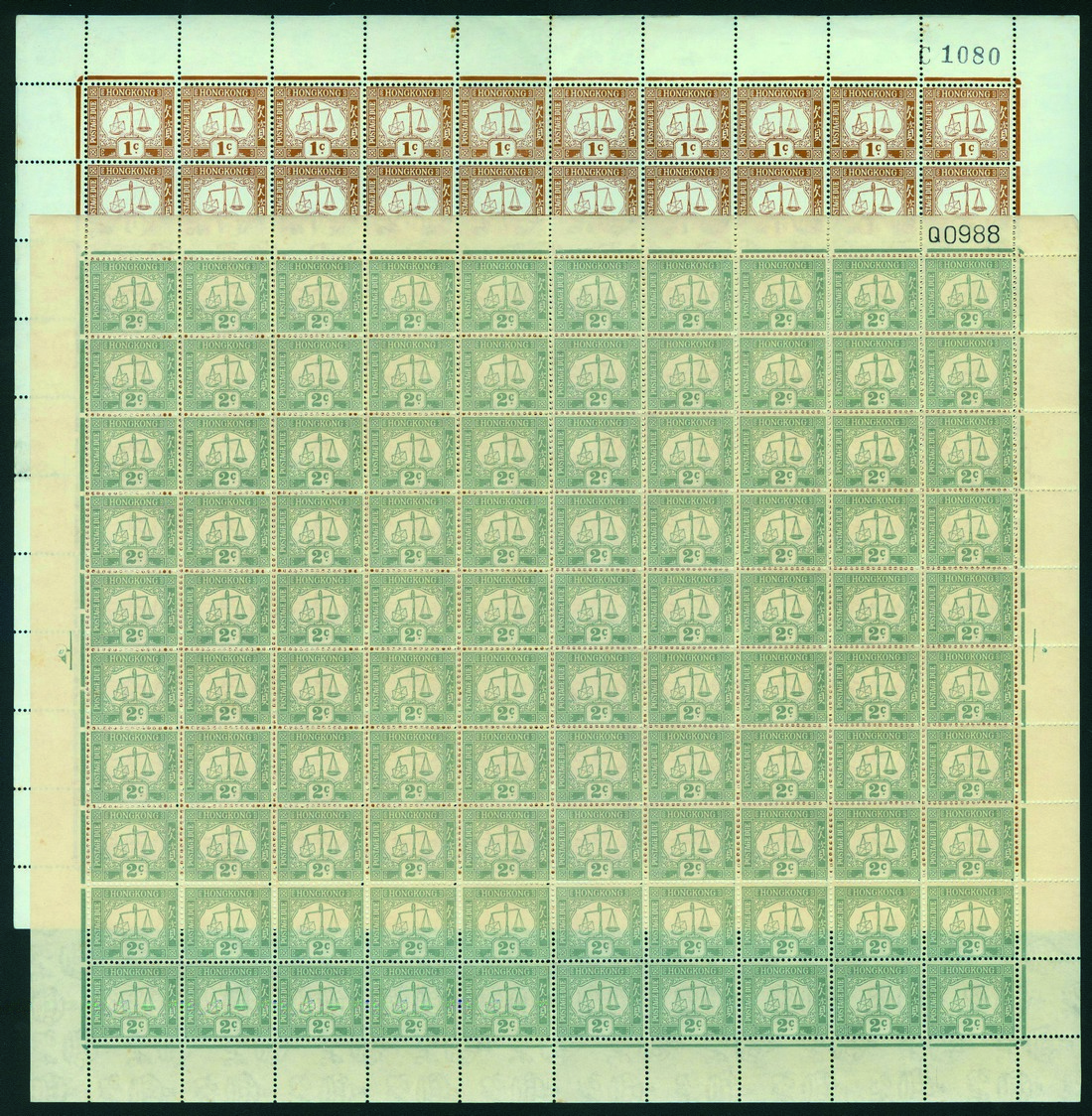 1938-56 Postage Due Issues 2c Green and 1c Brown, both in complete sheet of 100, unmounted mint with light tropical toning (200).