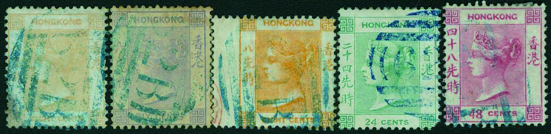 “62B” in Blue: A Small Group of Five, including 1862 8c (thin), 1863-71 6c and 8c with wing margin (reperf at foot), 24c (blunt corner) and 48c, a useful group (5).