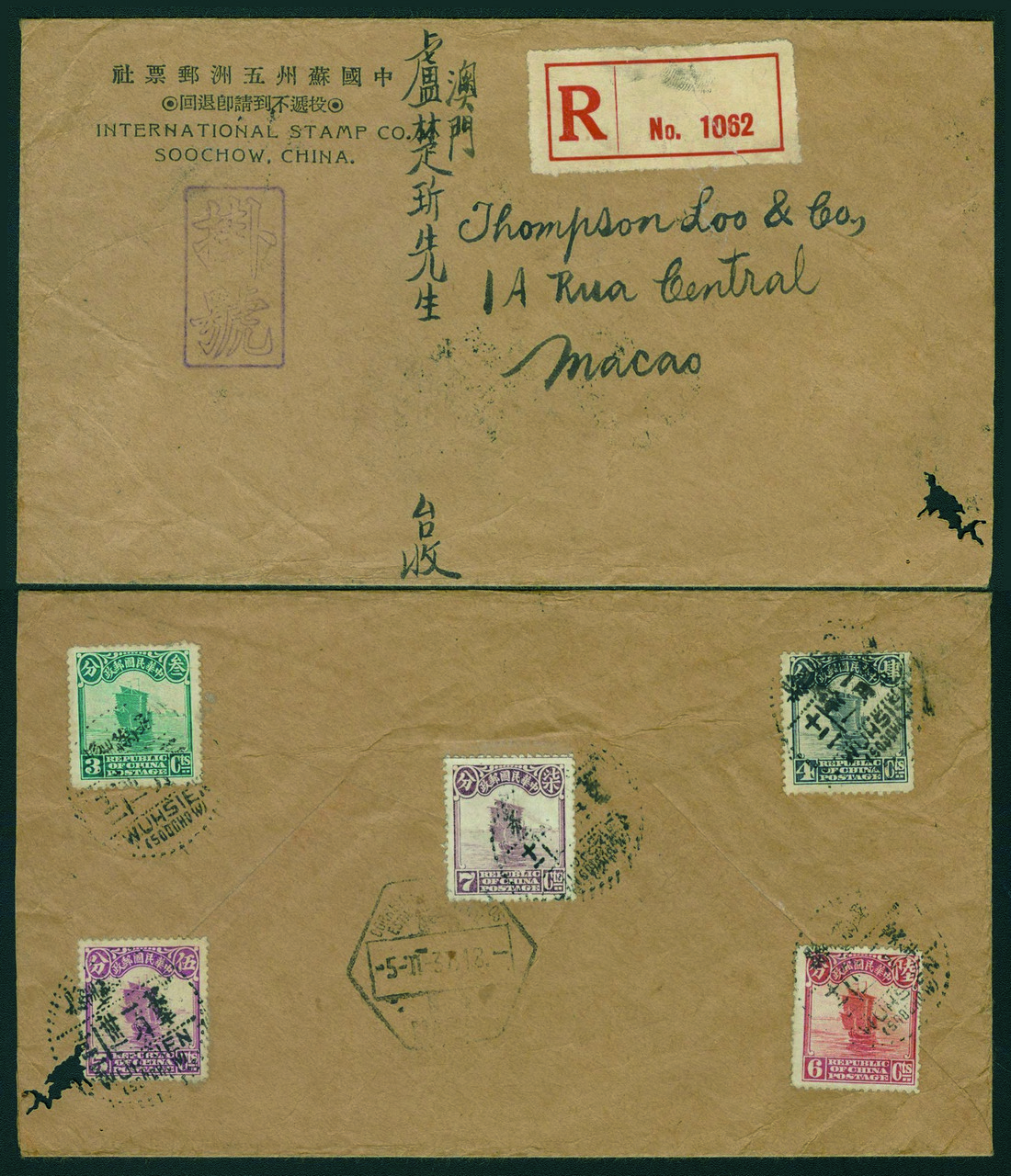 1937 (January 31) Last Day Usage of June Series, registered cover from Soochow to Macau, on reverse franked with 2nd Peking Junk Series 3c, 4c, 5c, 6c & 7c, tied by Soochow cds, Macau hexagonal arrival cds alongside, on front bearing registration label and rectangular handstamp in Chinese.