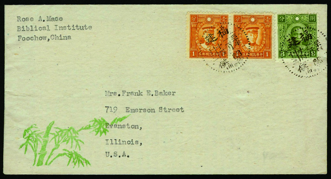 1941 (February 14) Printed Matter Cover from Foochow to USA, franked with Hong Kong print 1c Martyr pair and 8c Dr SYS Chung Hwa print, canceled by Fukien cds, believed to be earliest known cover for the Chung Hwa print 8c.