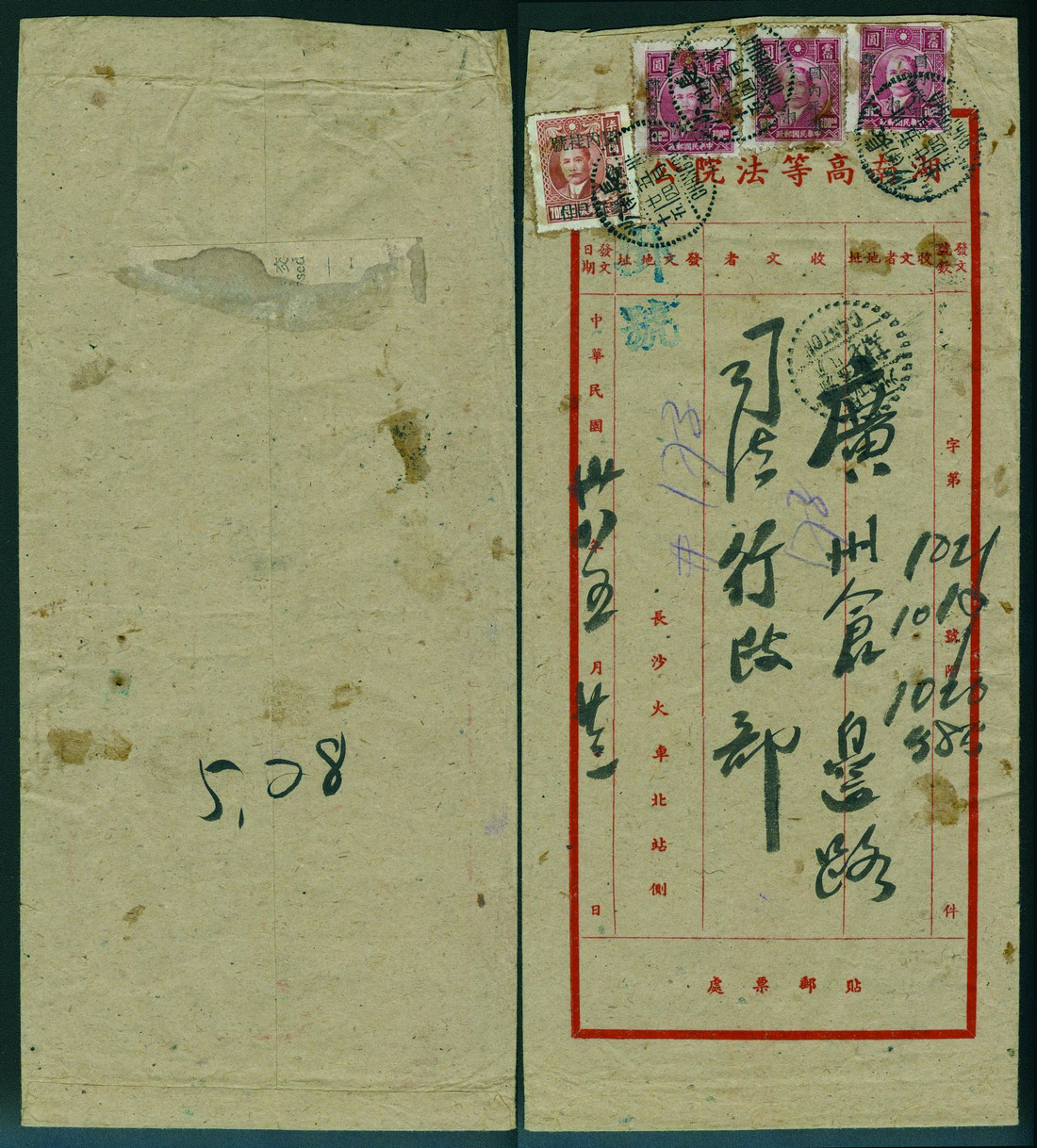 1949 (May 24) Registered Printed Native Cover to Canton, bearing “Hunan” Silver Yuan overprints on Dr SYS issues, tied by Changsha cds, Canton arrival cds alongside.