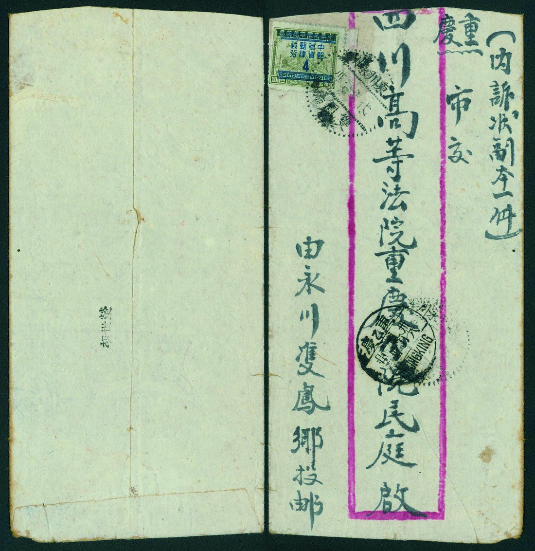 1949 (June 30) East Szechwan Yungchow Shuangfungchang to Chungking Native Cover, bearing revenue surcharge 4c on $100, canceled by scarce Chinese Yungchow Shuangfungchang Postal Agency date chop, Chungking arrival cds alongside.