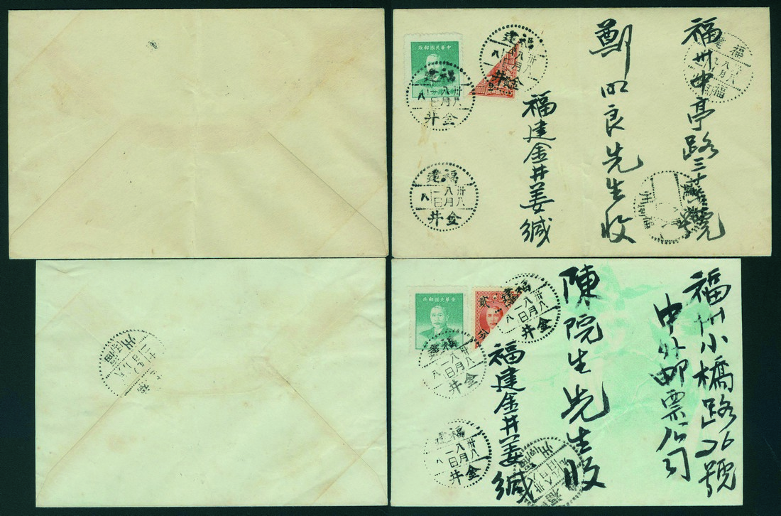 1949 (August 1) Pair of Fukien Kintsing to Foochow Covers, each franked with Dr SYS Hwa Nan Print 4c and 2c bisect, canceled by Kintsing cds with Foochow arrival cds alongside (2).