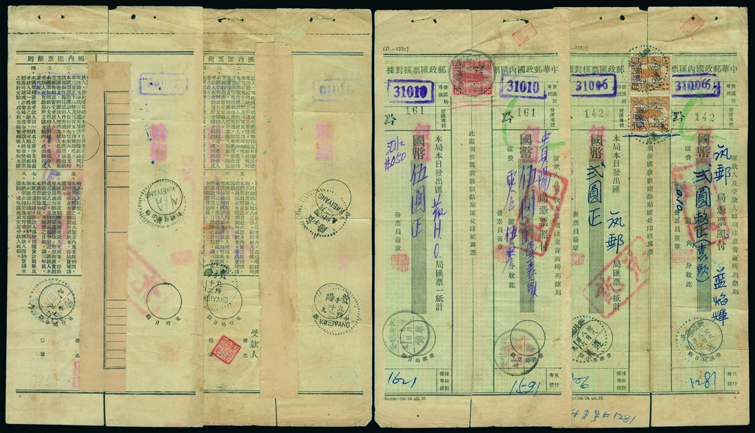 1949 (August 26 & September 6) Group of Two Republic of China Remittance Receipts, franked with $1(2) & $5 money order stamps tied by Zunyi & Bijie Postal Savings cds.