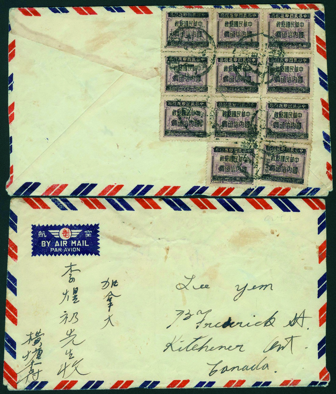 1949 (September 24) Air Mail Cover to Canada, franked with revenue surcharges, canceled by Canton cds, unusual overseas usage of Kwangtung Unit Stamps, very well preserved.