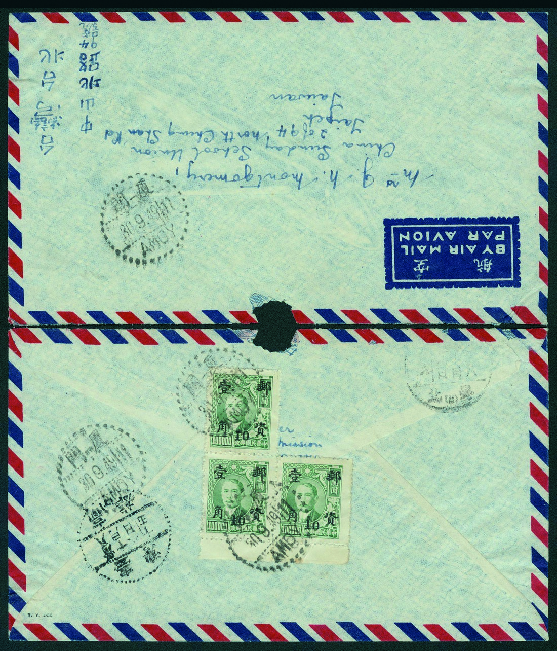 1949 (September 30) Amoy to Taiwan Registered Air Mail Cover, franked on reverse with Shanghai Dah Tung Dr SYS surcharges, canceled by Amoy cds, Kaoshiung transit and Taipei arrival cds alongside.