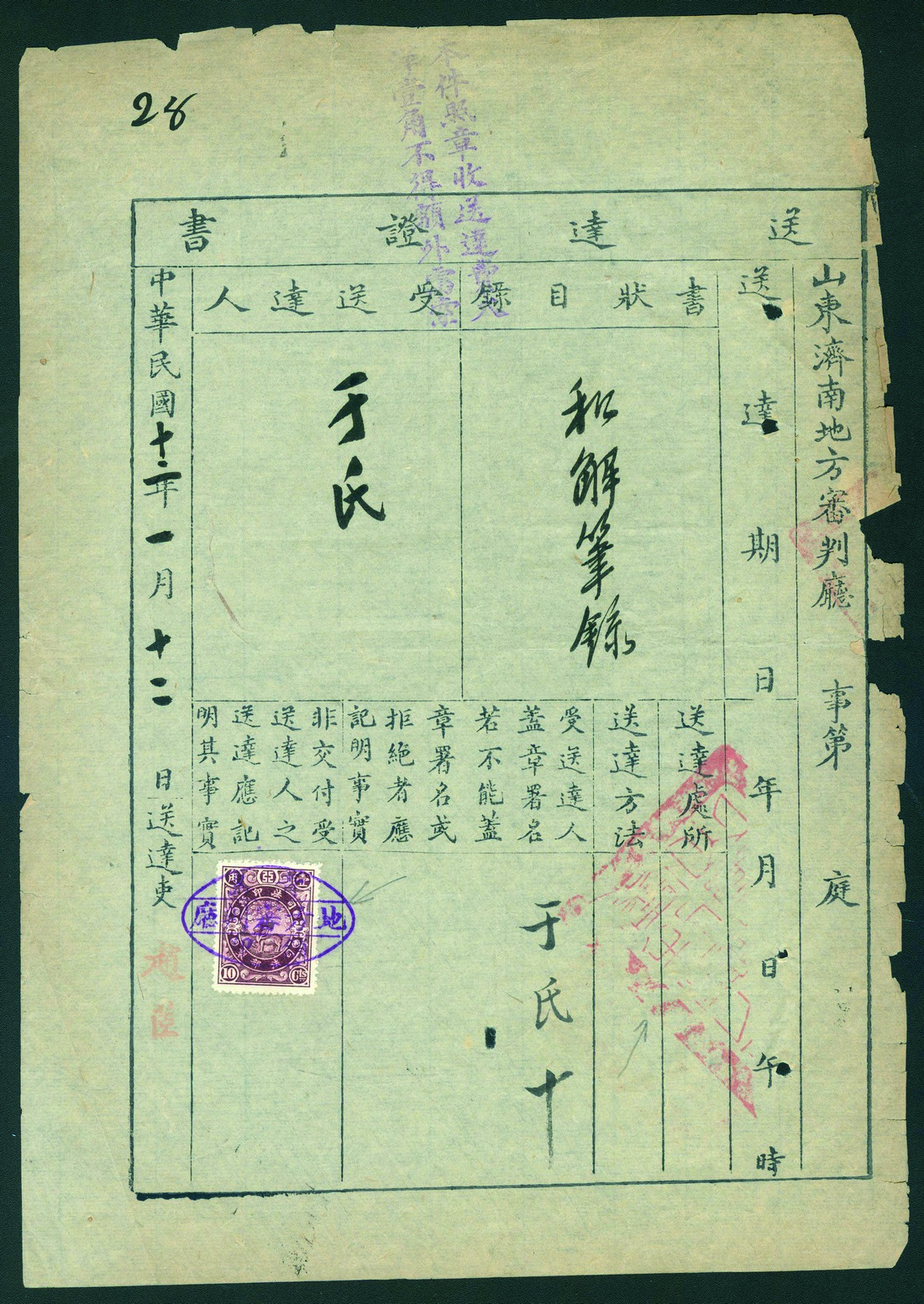 1923 (January 12) Court Document Delivery Certificate, bearing Judicial Revenue 10c, tied by oval Tsinan Local Court handstamp, fine.