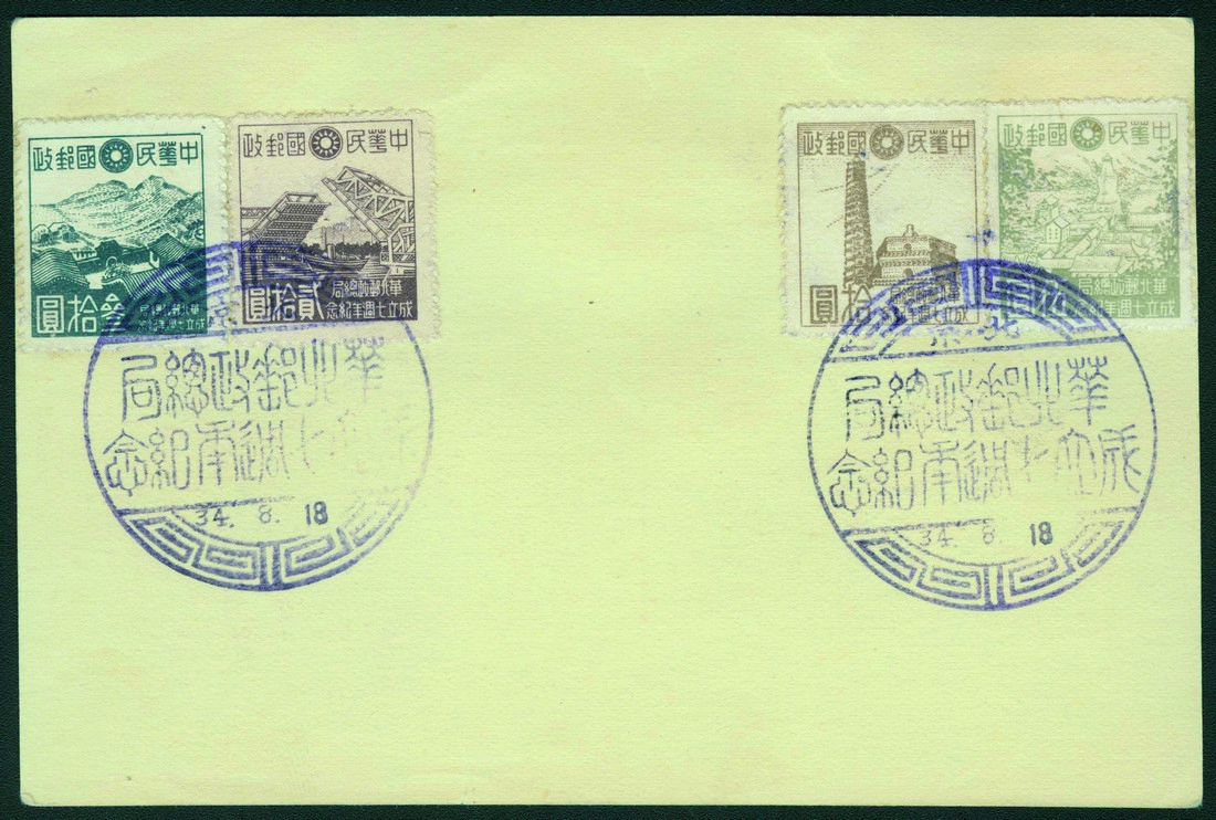 1944 North China Postal Stationery Card (H&G 71; Han NC12), Dr SYS 8c green card (small “8”) with two character “North China” overprint and $1 on 9c surcharges, $1 surcharge shifted to right 10mm (ran out of frame variety), franked on front and on reverse Post Office set of five, tied by special commemorative chop.