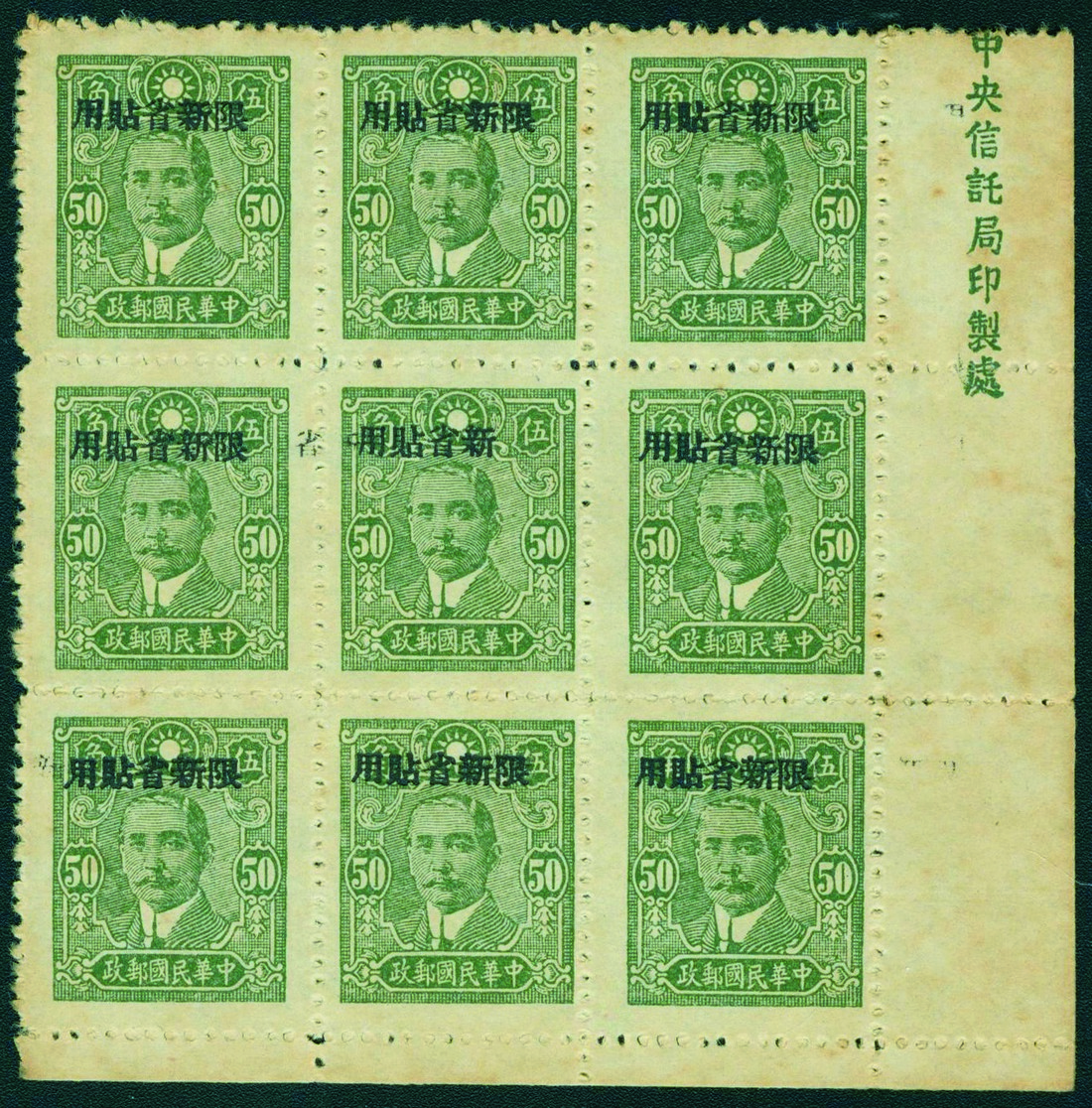 1942 “Sinkiang” Overprint on Dr SYS Central Trust Print 50c Sage-green (Scott 167var), bottom right margin imprint block of nine, middle stamp with overprint character “Limited” omitted and extra two character “Sinkiang Province” printed at left, unused as issued with age toning (9).