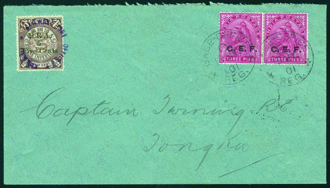 1901 (May 19) Plain Captain Twining Cover to Tongku, franked with CEF overprint India QV 3p pair, tied by Base Office cds, green BRA 5c on CIP at left and tied by Railway Post Office Tientsin round chop in violet, FPO No 4 arrival cds on reverse, a late letter service charge was introduced on 20 April 1901, BRA 5c was used for the collection of the 5c fee, and could only be used in combination with CEF stamps, this late fee charge was abolished on 20 May 1901 and BRA 5c stamps were then withdrawn.