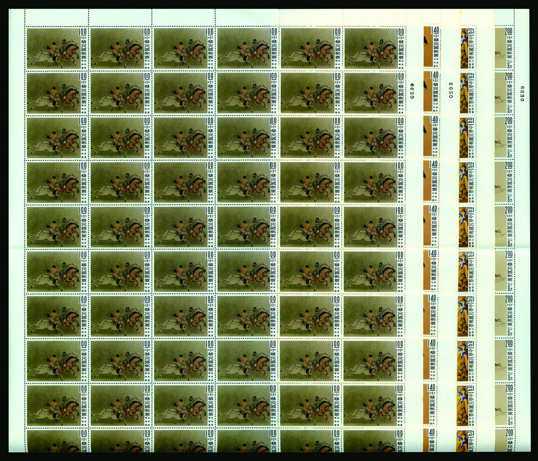 1960 (August 4) Ancient Chinese Paintings from Palace Museum Collection, 1st series (SG 358-361), set of four in complete sheets of 50, folded at middle perforation, pristine condition, unmounted mint, scarce multiples (200).