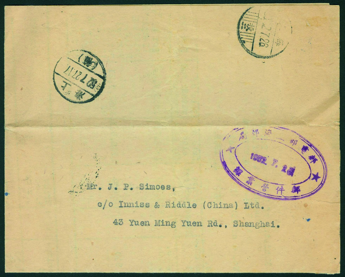 1952 (July 25) Ministry of Posts and Telegraphs Shanghai Post Office Stamp List No 4, addressed locally, bearing oval Mail Business Department datestamp in purple, on reverse Shanghai July 26 transit and July 27 arrival cds, fine document for early PRC philatelic business study.