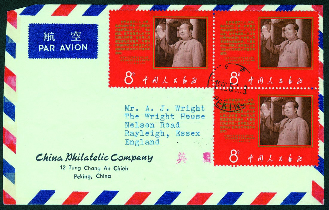 1968 (May 31) Chairman Mao’s Anti-American Declaration (Yang W9), three examples on printed China Philatelic Company air mail cover to England, tied by first day Peking cds, very scarce first day postally used cover.