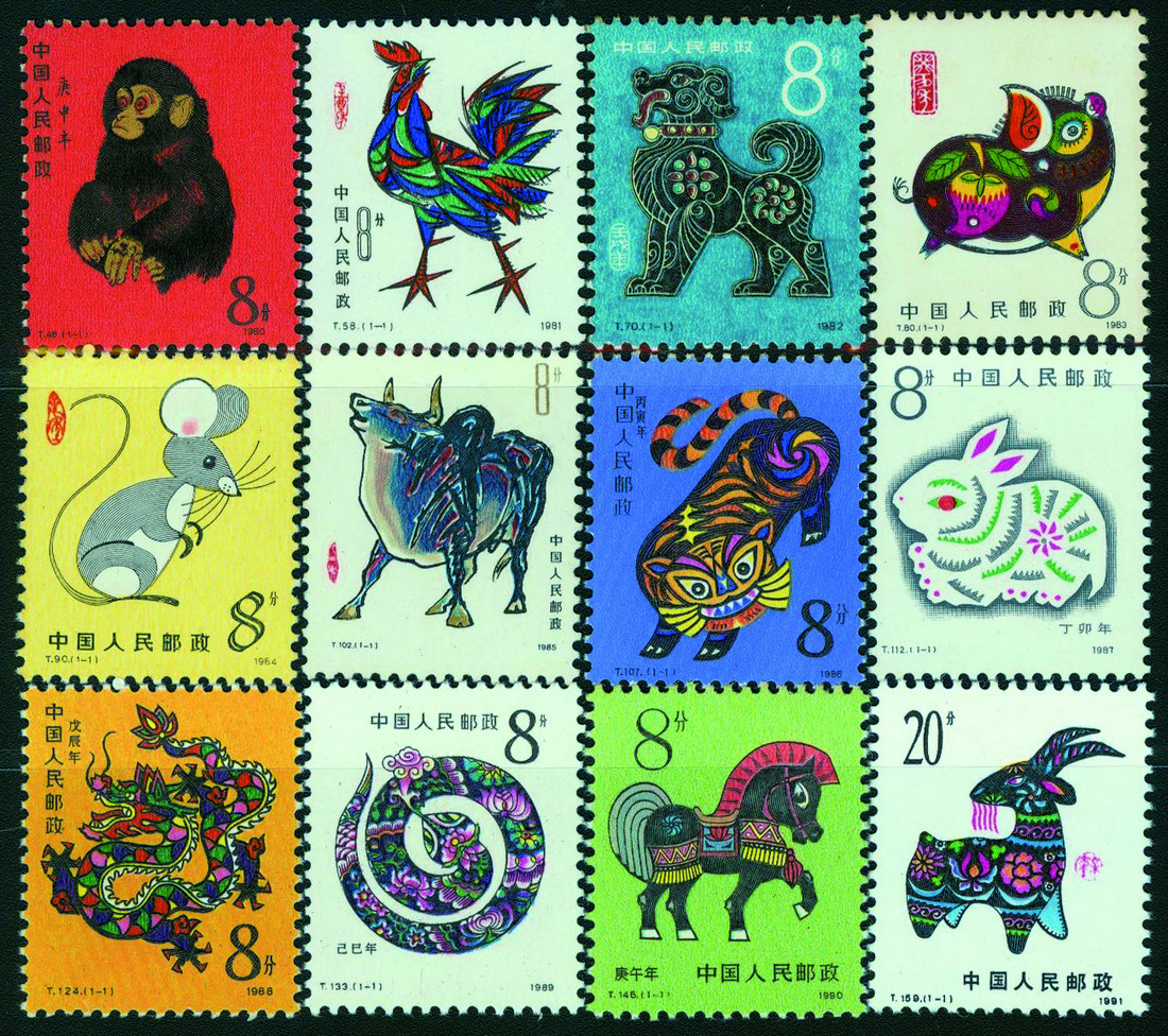 1980-1991 Lunar New Year Issues (Yang T46//T159), complete run of twelve in singles, light toning on Monkey stamp and a few other minor issues, otherwise fine (12).