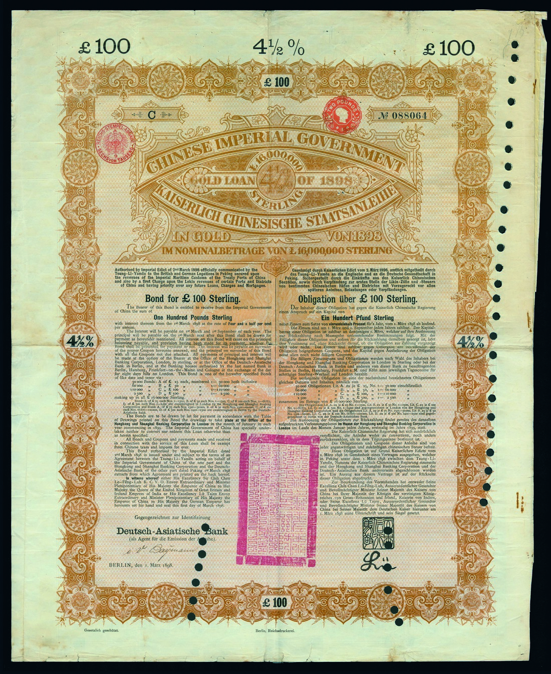 Chinese Imperial Government, 4?% Gold Loan, 1898 ?25, ?50, ?100, issued by the Deutsch-Asiatische Bank, large format, red, orange and brown respectively, with coupons, all hole cancelled, fine to very fine.(3)
