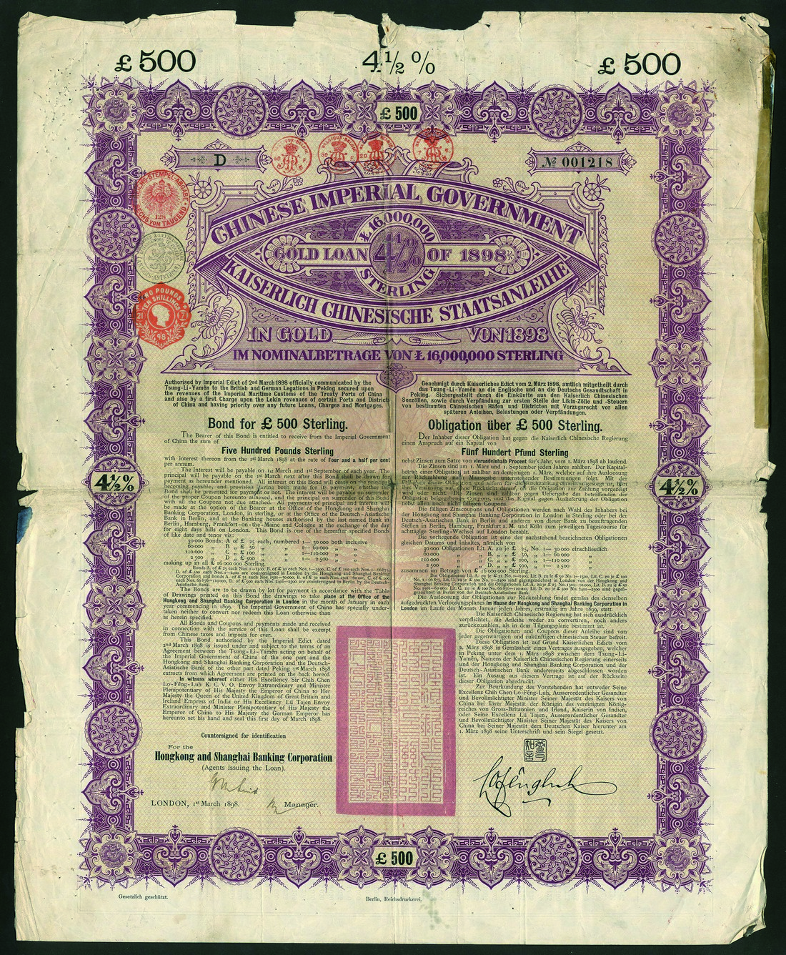 Chinese Imperial Government, 4½% Gold Loan, 1898, bond for £500, issued by the Hongkong and Shanghai Banking Corporation, no.001218, large format bond with ornate borders, mauve and black with yellow underprint, text in English and German, with coupons, ragged top edge, some separation at folds, good fine and rare