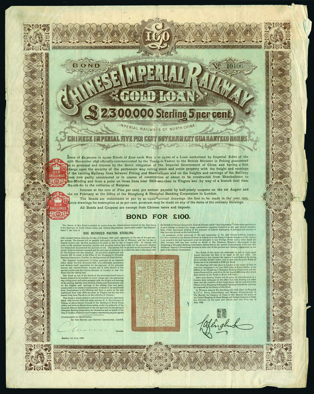 1899, Chinese Imperial Railway 5% Gold Loan, bond for £100, no.10106, large format with ornate border, text all in English, red chop in centre, brown with pale blue underprint, with coupons, small tear top right corner, creased, fine to very fine.