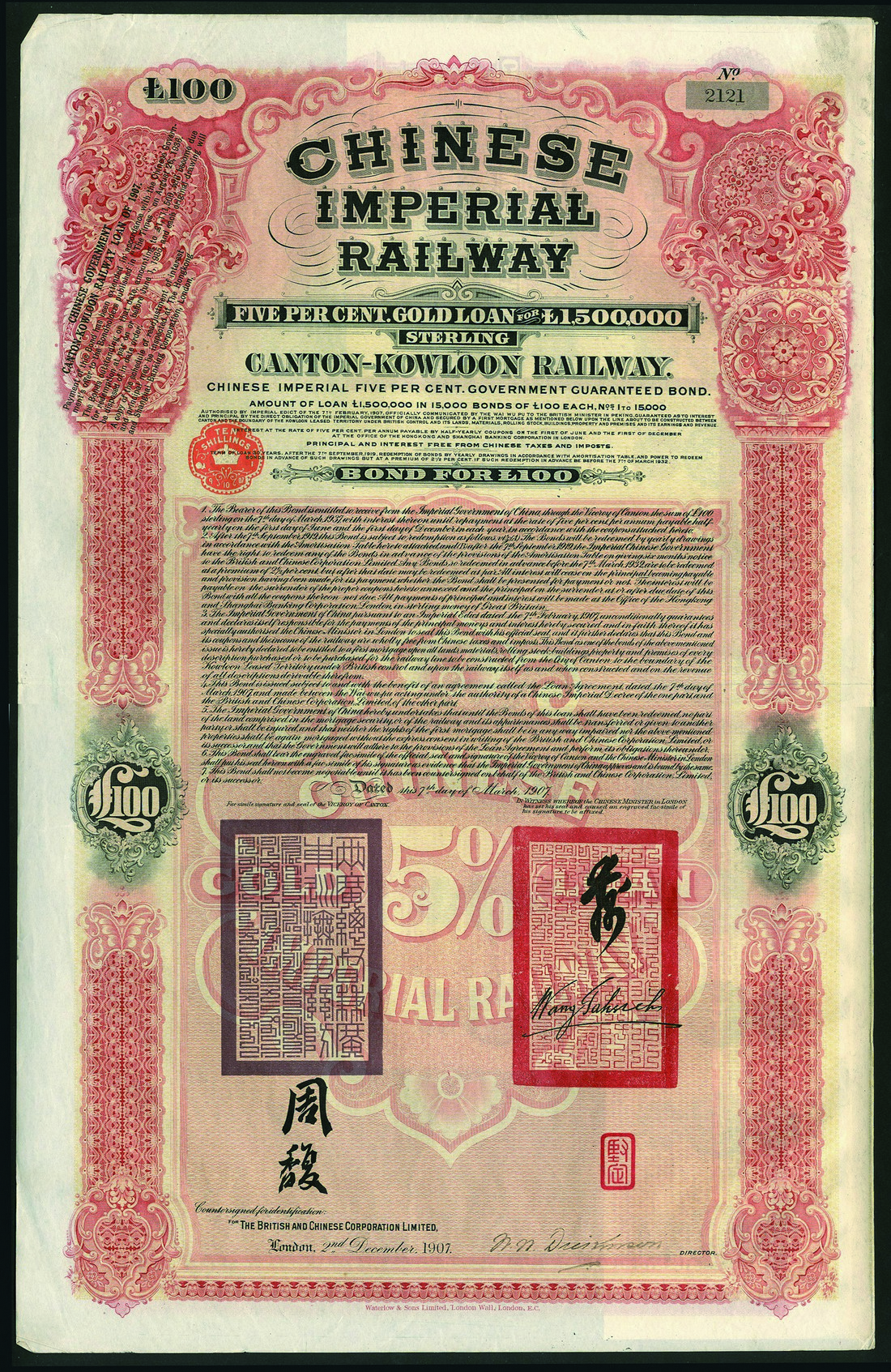1907 Canton Kowloon Railway 5% Gold Loan, bond for £100, no.2121, ornate border, red and black, two 'chops' at bottom, with coupons, good very fine.