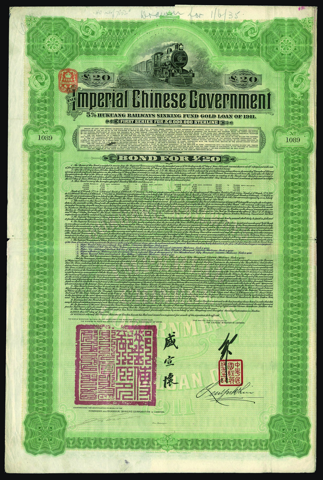 Imperial Chinese Government, 5% Hukuang Railways Gold Loan of 1911, bond for £20, issued by the Hongkong and Shanghai Banking Corporation, no.1089, large format piece with vignette of steam train at top, ornate border, green and black, printed by Waterlow & Sons, with coupons, very fine and scarce issue