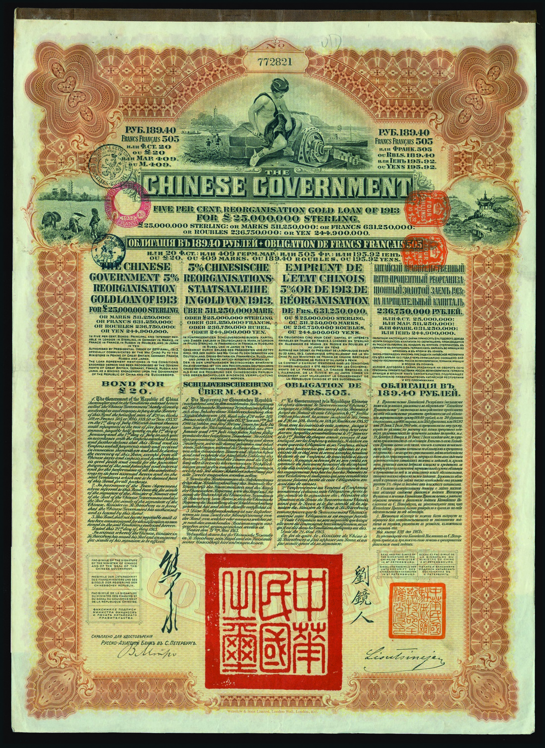 1913 5% Reorganisation Gold Loan, a group of 5 bonds for £20 or 189.40 roubles, issued by the Russo-Asiatic Bank, 'Mercury' at top, peasants and buildings at either side, brown and black, printed by Waterlow & Sons, with coupons, very fine and better.(5)